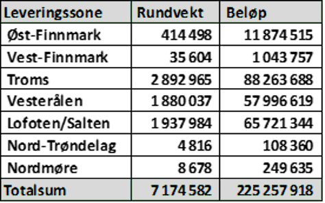Av nevnte 7.306 tonn fisket fram til og med 25. august, inngår 7.175 tonn/225 millioner kroner i de to periodene med direktefisket. Herav var 4.744 tonn/147 millioner kroner omsatt fra fisket i 1. periode, og 2.431 tonn/79 millioner kroner i 2. periode.