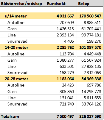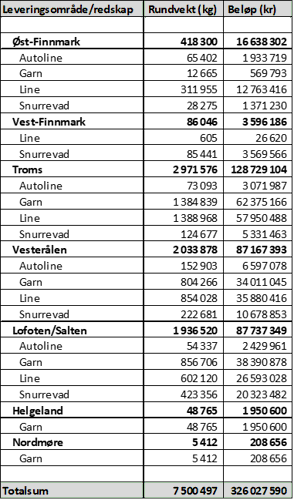 Samlet for begge perioder ble det levert 7 500 blåkveite til en verdi av 326 millioner kroner i Råfisklagets område. Tilsvarende tall fra fjorårets omsetning var 7 175 tonn blåkveite til en verdi av 225 millioner kroner.