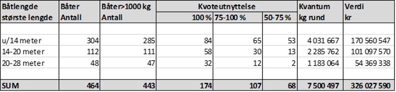 Tabellen under viser at de minste båtene hadde dårligst kvoteutnyttelse. Her var det 84 av totalt 285 båter, eller 29 %, som fisket hele maksimalkvoten på 20 tonn. I størrelsesgruppen 14-20 meter var det 58 av 111, eller 52 %, som fisket hele maksimalkvoten på 22,5 tonn. I gruppen 20-28 meter var det 32 av 47, eller 68 % som fisket hele maksimalkvoten på 25 tonn.