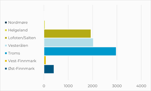 Størst kvantum ble levert til kjøpere i Troms, som hadde ganske lik fordeling i leveransene mellom blåkveite fanget med redskapene line, autoline og garn. Deretter følger Vesterålen og Lofoten. Fiskekjøpere i Lofoten tok i mot en større andel blåkveite som var fanget med snurrevad enn de øvrige områdene - hele 59 % av all snurrevadkveita ble levert i nettopp Lofoten. Fordelingen er illustrert i grafen under.