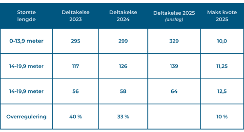 Antallet båter som har levert blåkveite i perioden er noe høyere enn de to foregående årene, 488 med kvanta over 1.000 kg mot 447 i 2024 og 443 i 2023. Dette kan ha sammenheng med fiskets varighet i år, som i større grad involverer fartøy som har fisket blåkveite som bifangst. Det er først og fremst i båtstørrelsen 0-14 meter deltakelsen har økt, opp fra 284 i fjor til 326 i år. I de to andre størrelsesgruppene er det liten endring. Når det gjelder kvoteutnyttelse er det en klar tendens at en større andel av deltakende båter har nådd eller nærmer seg kvotetaket. Det er også mange som har fisket over kvoten, for de fleste innebærer det et bifangstfiske etter at fartøyets maksimalkvote er fisket.