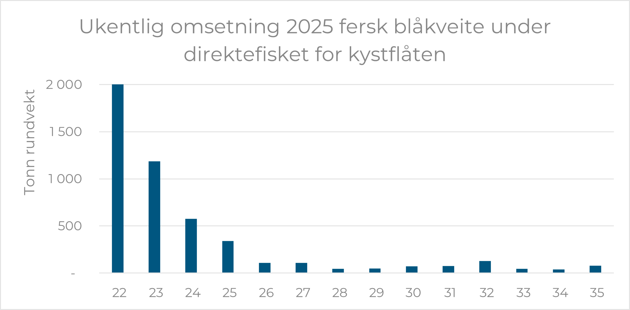 I 2025 har fisket som nevnt vært regulert i en periode, kombinert med lavere overregulering av maksimalkvotene pr fartøy. Gruppekvoten på 5.142 tonn var i slutten av august beregnet oppfisket, og Fiskeridirektoratet stoppet fisket 31. august. I perioden fra direktefisket startet 26. mai (uke 22) og fram til 31. august (uke 35) har Norges Råfisklag hatt ei omsetning av fersk blåkveite fra båter u/28 meter største lengde på totalt 4.859 tonn til verdi 289 millioner kroner. Kvantumet er dermed ned 13 % sammenlignet med 2024, mens verdien er opp 23 %. I likhet med årene før er det meste levert i rund tilstand, nærmere bestemt 4.661 tonn (96 %)/279 millioner kroner som gir en snittpris på kr 59,81 pr kg rundvekt. Prisen fikk dermed nok et betydelig løft sammenlignet med de to årene før, og sammenlignet med 2022 da snittet var rundt 31,50 pr kg rund er prisen opp 90 %.