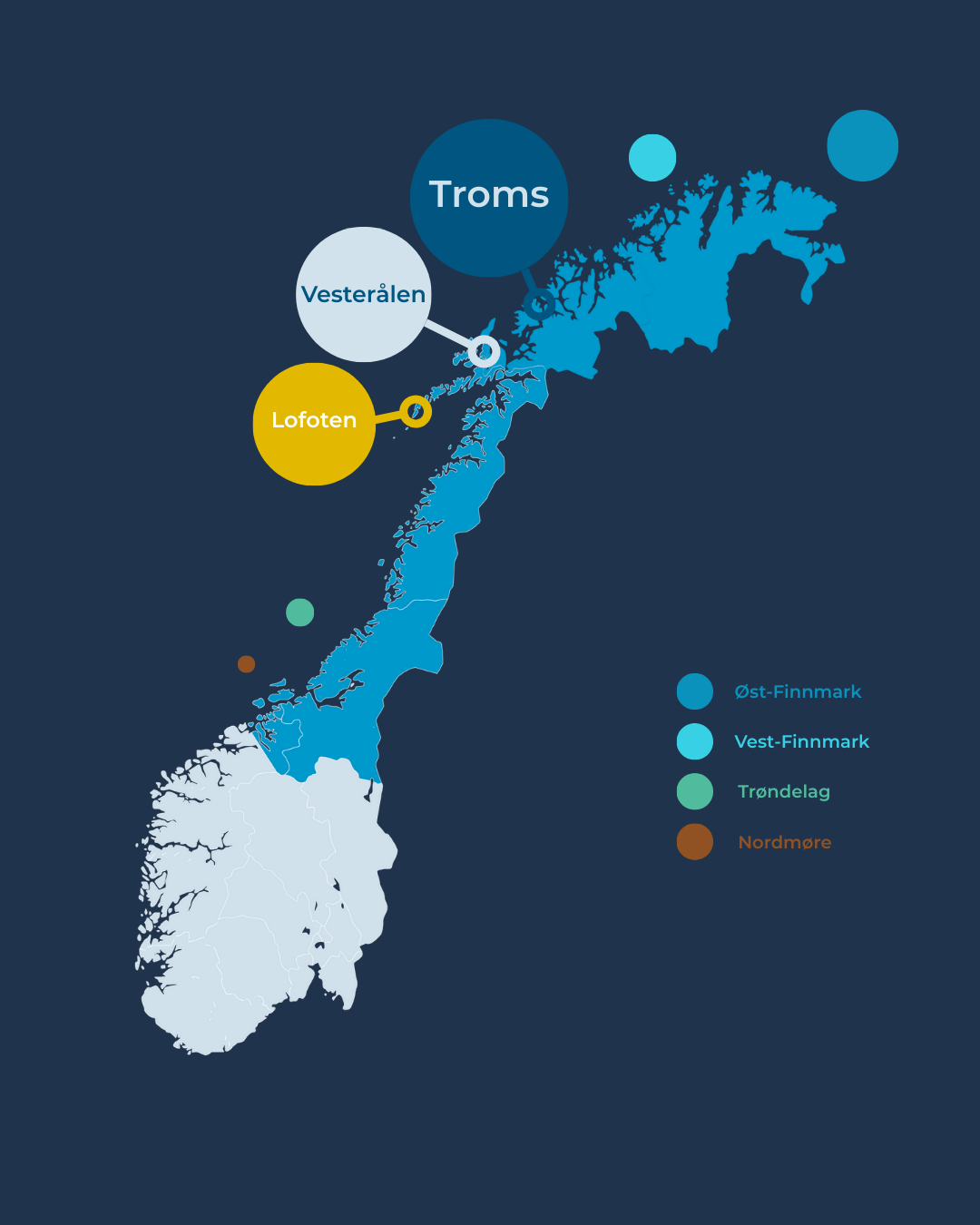 Nesten 90 % av blåkveitefangstene ble levert til fiskemottak i Troms, Vesterålen og Lofoten.