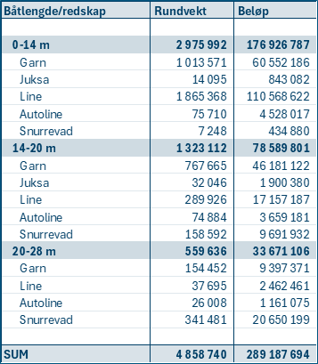Av tabellen framgår at størst andel av totalen er tatt av båtene i størrelsesgruppen u/14 meter, nærmere bestemt 61 %. Andelen tatt i denne gruppen økte fra 54 % året før. På samme vis som året før var det line/autoline som dominerte med størst andel av kvantumet i den minste størrelsesgruppen. Garn var dominerende i gruppen 14-20 meter, mens snurrevad stod for det meste av leveransene i gruppen 20-28 meter. Totalt for alle 3 størrelsesgruppene var 2.370 tonn (49 %) tatt på line/autoline, 1.936 tonn (40 %) på garn og 507 tonn (11 %) på snurrevad. Som en følge av at økt andel i år er fisket av båter u/14 meter der det også er størst andel linefangst, er andelen tatt på line/autoline totalt også opp, fra 41 % året før, mens garnandelen er redusert fra 45 % året før.