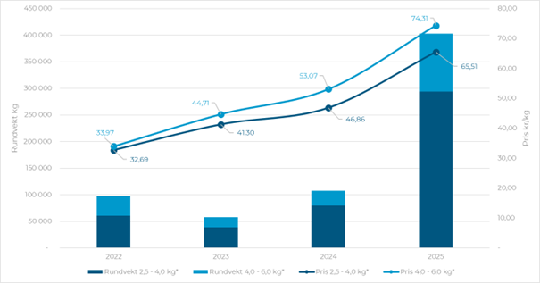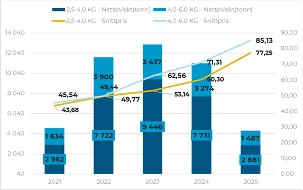 Administrasjonen har dermed utarbeidet forslag til nye klasseinndelinger, som ble presentert og diskutert med kjøperorganisasjonene under prisdrøftelsene 12. desember 2025. Partene ble enige om vektklasser og prisdifferanser som framgår av tabell 1.