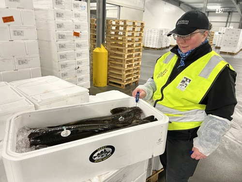 Etter to år med koronarestriksjoner kunne Råfisklagets Skreipatrulje igjen utføre den viktige jobben med å sjekke kvalitetsmerket Skrei på vei til markedet, på omlastingsterminaler i Europa. Lillian Hansen registrerte til sin glede at fisken generelt var av god kvalitet. Foto: Einar Mortensen.
