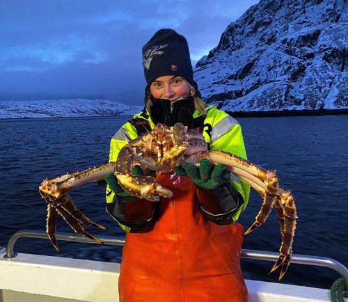 Susanne Utse Olsen er fisker i Finnmark og en av de som har levert kongekrabbe i år. Her holder hun et fint eksemplar.