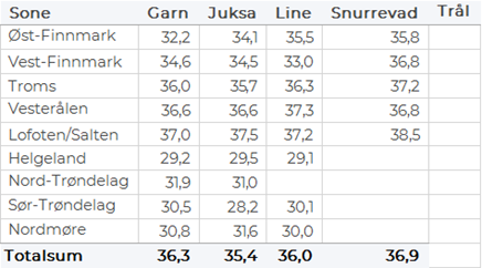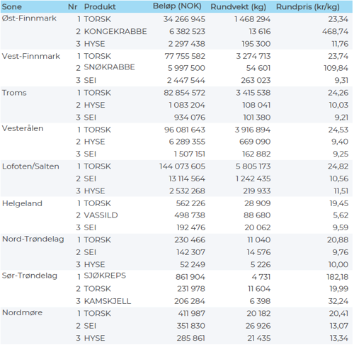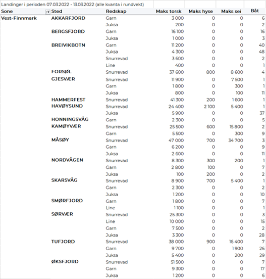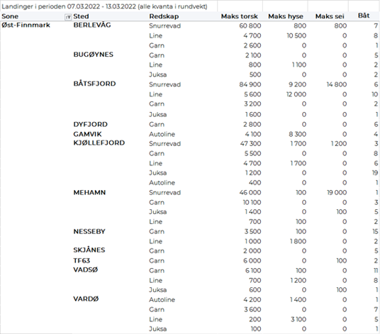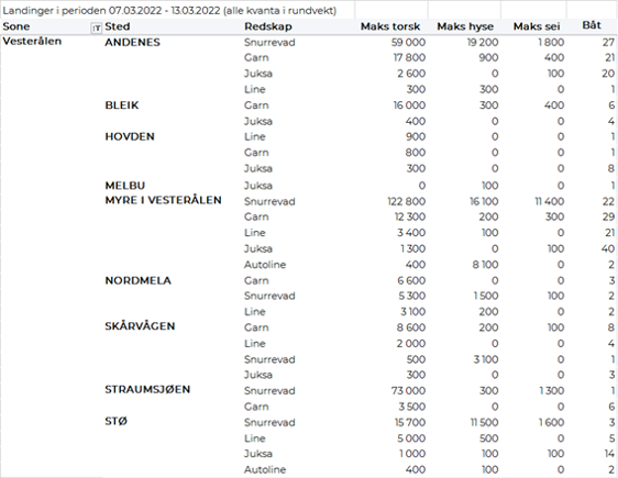 Størst garnkvantum torsk levert i Lofoten med 4.760 tonn, fulgt av Troms med 2.050 tonn, Vest-Finnmark med 1.150 tonn, Vesterålen med 830 tonn, Øst-Finnmark med 280 tonn og Helgeland-Nordmøre med 60 tonn. Snurrevadkvantumet var fordelt med 2.940 tonn levert Vesterålen, 1.600 tonn i Vest-Finnmark, 1.150 tonn i Troms, 1.050 tonn i Øst-Finnmark og 680 tonn i Lofoten. Av juksakvantumet på totalt 900 tonn var 470 tonn levert i Vest-Finnmark, 160 tonn hver på Troms og Lofoten og ellers labert. 160 tonn av linetorsken var levert i Lofoten, for øvrig jevnt med 70-100 tonn på sonene fra Øst-Finnmark til Vesterålen.