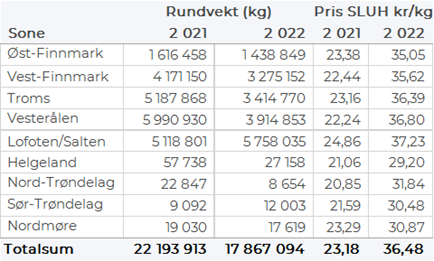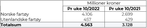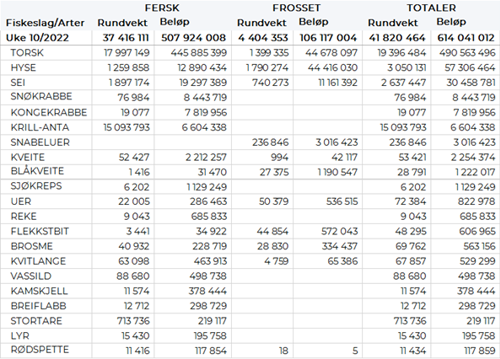 Totalomsetningen hittil i år sammenlignet med tilsvarende periode i fjor framgår av tabell 1. Den økte omsetningen for norske båter er på godt og vel 1,4 milliard kroner, fordelt med pluss på 883 på fersk- og 524 på frystomsetningen. Frystomsetningen er pr uke 10 i år på 1.517 millioner kroner, mens ferskomsetningen er oppe i 2.589 millioner kroner. En stor del av den økte frystomsetningen skriver seg fra sluttspurten i 2021 der kvantumet er omsatt på begynnelsen av 2022. Men økt omsetning av fryst råstoff også i uke 6, da ny ukerekord ble satt med 275 millioner kroner. Omsetningen av fryst torsk pr uke 10 i år er 946 millioner kroner mot 600 millioner kroner til samme tid i fjor, av kvantum på henholdsvis 33.450 og 29.800 tonn. Også fryst sei og hyse har ei fin øking både i kvantum og verdi. Når det gjelder omsetningen av fersklevert råstoff, drar torsken opp både pga. økte priser og økt kvantum. Kvantum fersk torsk omsatt så langt er 78.880 tonn, mot 76.000 tonn til samme tid i fjor, verdien er opp fra 1.290 til 1.950 millioner kroner. Omsatt kvantum fersk sei er opp 2.530 tonn til 16.670 tonn, og verdien er opp fra 105 til 164 millioner kroner. Kongekrabbekvantumet er opp fra 552 til 670 tonn, og som følge av økte priser er verdien økt med 136 %, fra 118 til 278 millioner kroner.