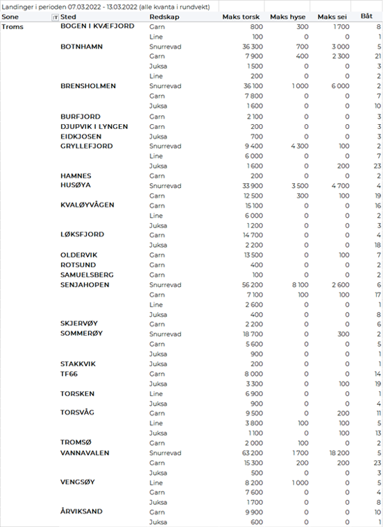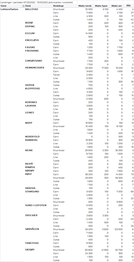 Omsetningen av ferskt råstoff i uke 10 utgjorde 508 millioner kroner, opp fra 290 millioner kroner uka før. Av det utgjorde 18.000 tonn fersk torsk 446 millioner kroner, jf tabell 2. Dette er toppkvantum så langt i år. Det kom etter tre uker på rad med ukekvantum i størrelsesorden 9.800-11.300 tonn. Tilsvarende uke i fjor nådde kvantumet vel 22.000 tonn som var topp for året, da med ukeverdi 356 millioner kroner. Garn stod halvparten av kvantumet i uke 10 i år, nærmere bestemt 9.120 tonn, fulgt av snurrevad med 7.430 tonn, juksa med 900 tonn og line/autoline med 530 tonn. Den geografiske fordelingen var 5.770 tonn levert i Lofoten, 3.920 tonn i Vesterålen, 3.450 tonn i Troms, 3.320 tonn i Vest-Finnmark, 1.470 tonn i Øst-Finnmark og 70 tonn i området Helgeland-Nordmøre. Det var øking over hele linja sammenlignet med ukene før, mest for Lofoten som økte fra 2.180 tonn uka før.