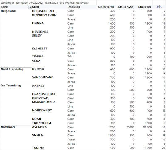 Omsetningen av fersk sei i uke 10 utgjorde 1.897 tonn til verdi 19,2 millioner kroner. En økning fra 1.360 tonn til verdi 13,7 millioner kroner uken før. Størst aktivitet er det i Lofoten som står for 1.241 tonn av totalen, hvorav 877 fra snurrevad og 334 fra garn. Det var dermed mer sei enn torsk i snurrevadfangstene levert Lofoten. I Vest-Finnmark er det levert 263 tonn, hvorav 252 kom fra snurrevad. I Troms er det levert 101 tonn, hvorav 80 tonn kom fra snurrevad. I Vesterålen var kvantumet 170 tonn der snurrevad stod for 150 tonn. Øst-Finnmark står for 58 tonn, hvorav 56 er tatt med snurrevad. Mindre kvanta i resterende soner.