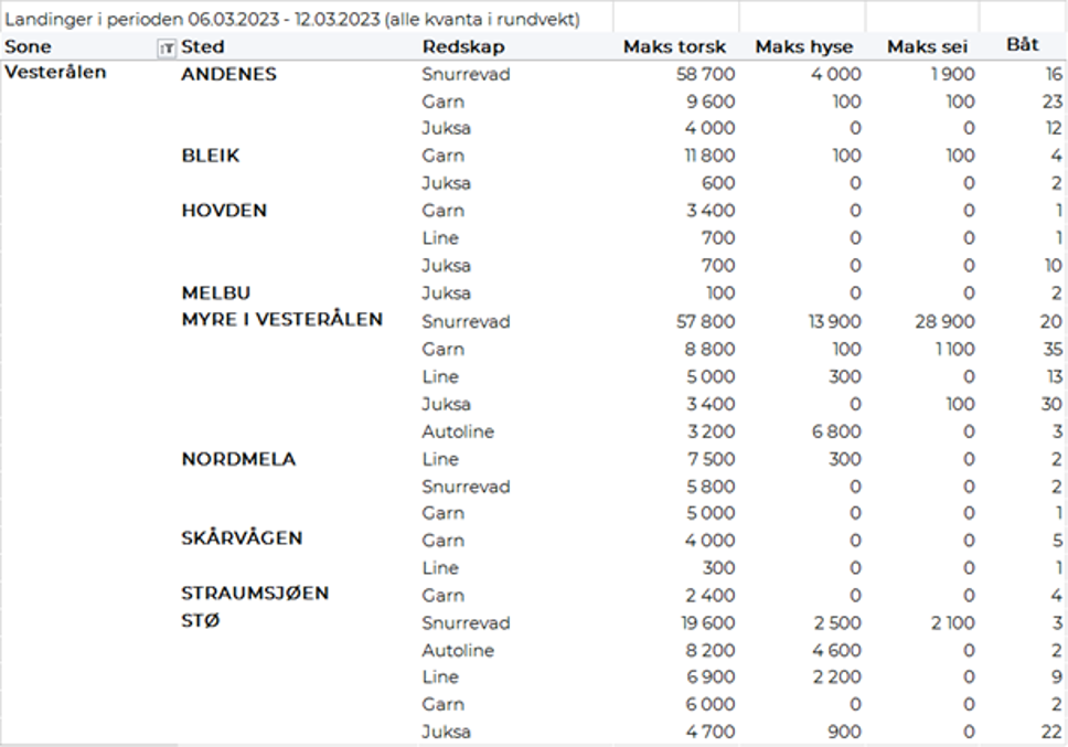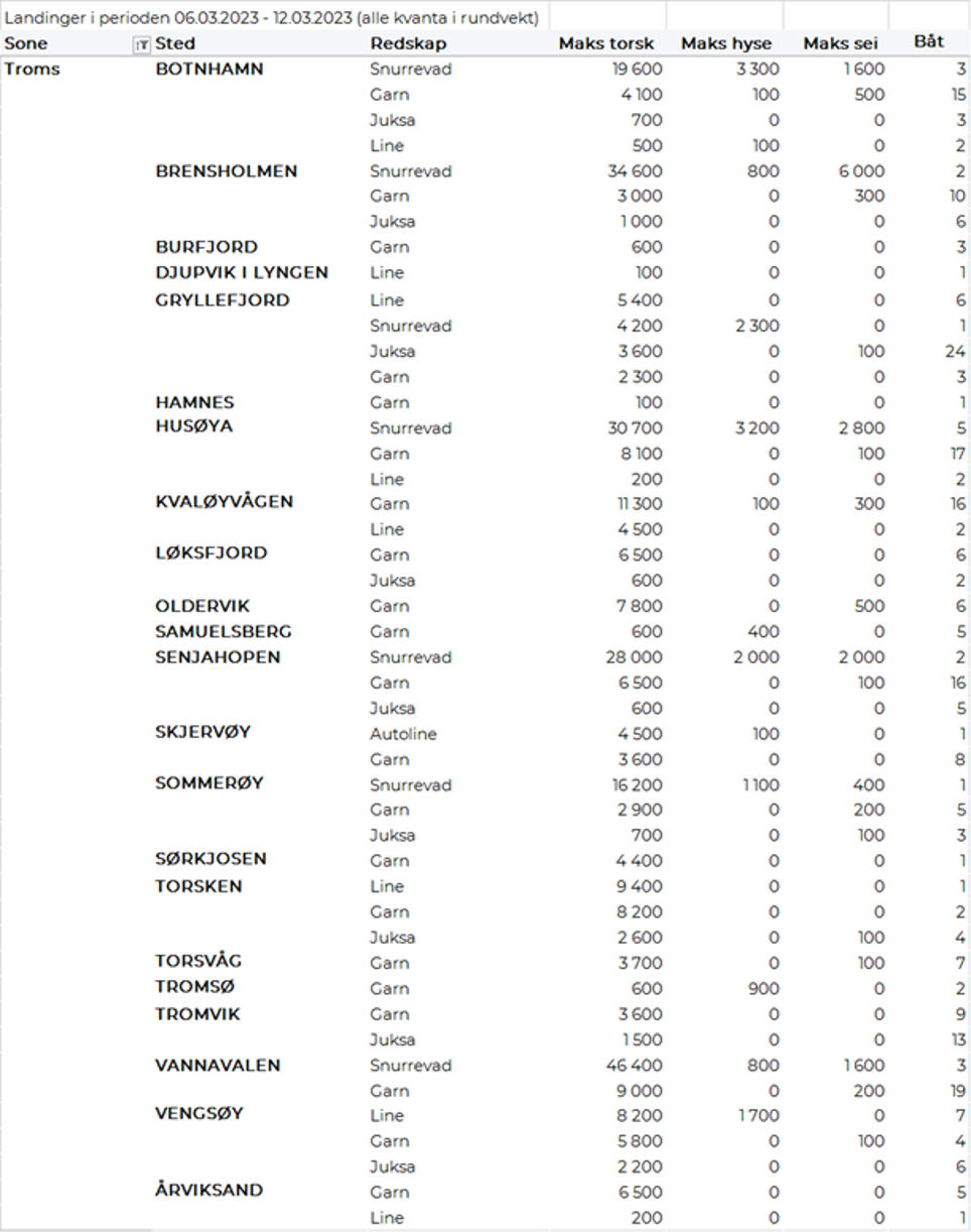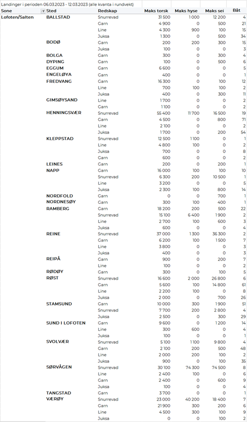 Omsetningen av fersk torsk, alle kvaliteter og tilstander, i uke 10 utgjorde 12.010 tonn til en verdi av 386 millioner kroner, som er høyeste ukeomsetning av fersk torsk så langt i år, opp fra 5.580 tonn og 179 millioner kroner uka før. Fordelt per redskap viser tallene 5.480 tonn fra snurrevad, 5.200 tonn fra garn, 675 tonn fra line/autoline og 650 tonn fra juksa. Det var ingen trållandinger med fersk torsk i uke 10. Lofoten var for første gang i år største leveringssone med 3.610 tonn. Deretter følger Vest-Finnmark og Vesterålen med 2.740 tonn på hver, Troms med 1.710 tonn, Øst-Finnmark med 1.160 tonn, og i området Helgeland-Nordmøre var det landa 67 tonn fersk torsk. Kvotebonusordningen for levendelagring av torsk startet opp 06. mars 2023 som er mandag i uke 10. Totalt er det avsatt 3000 tonn til ordningen der fangst som er lagret i over 3 uker kvotebelastes med 60 % av fangstkvantum, som tilsvarer 40 % bonus, mot 30 % i 2022. I løpet av uke 10 ble det satt 93 tonn i møre, hvorav 73 tonn i Lerøy sitt anlegg i Båtsfjord og 20 tonn i Levende Mellomlagring Vesterålen (LMV) sitt anlegg Staven på Myre. En forholdvis beskjeden start med andre ord.
