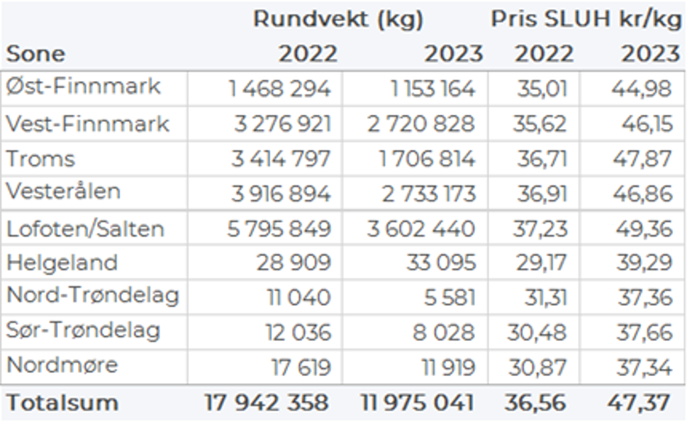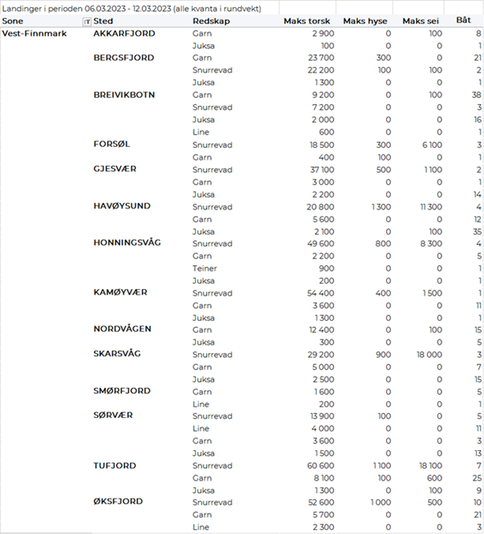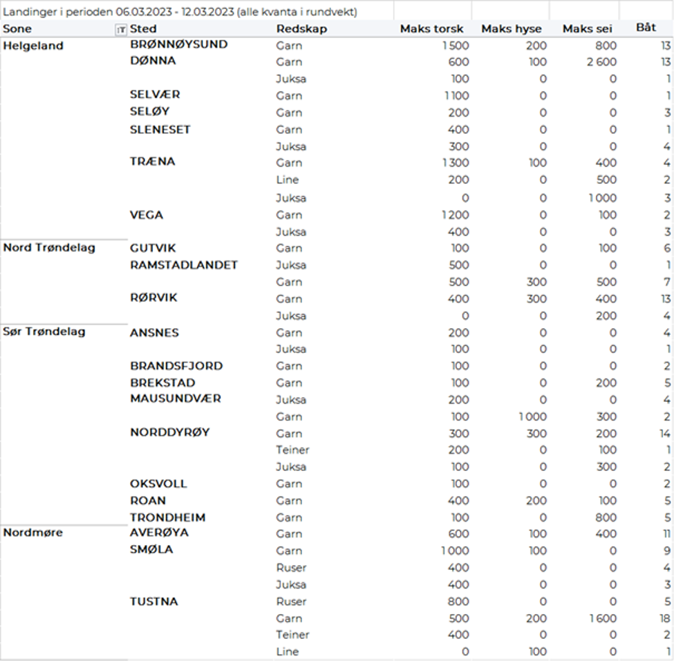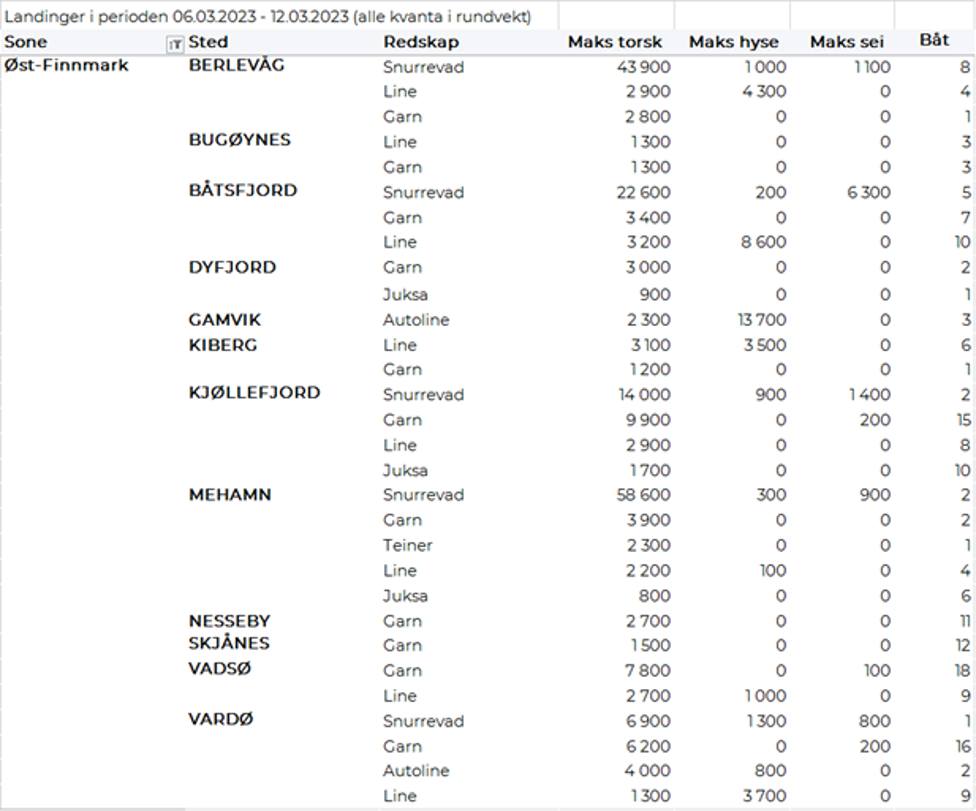 Omsetningen av fersk torsk, alle kvaliteter og tilstander, i uke 10 utgjorde 12.010 tonn til en verdi av 386 millioner kroner, som er høyeste ukeomsetning av fersk torsk så langt i år, opp fra 5.580 tonn og 179 millioner kroner uka før. Fordelt per redskap viser tallene 5.480 tonn fra snurrevad, 5.200 tonn fra garn, 675 tonn fra line/autoline og 650 tonn fra juksa. Det var ingen trållandinger med fersk torsk i uke 10. Lofoten var for første gang i år største leveringssone med 3.610 tonn. Deretter følger Vest-Finnmark og Vesterålen med 2.740 tonn på hver, Troms med 1.710 tonn, Øst-Finnmark med 1.160 tonn, og i området Helgeland-Nordmøre var det landa 67 tonn fersk torsk. Kvotebonusordningen for levendelagring av torsk startet opp 06. mars 2023 som er mandag i uke 10. Totalt er det avsatt 3000 tonn til ordningen der fangst som er lagret i over 3 uker kvotebelastes med 60 % av fangstkvantum, som tilsvarer 40 % bonus, mot 30 % i 2022. I løpet av uke 10 ble det satt 93 tonn i møre, hvorav 73 tonn i Lerøy sitt anlegg i Båtsfjord og 20 tonn i Levende Mellomlagring Vesterålen (LMV) sitt anlegg Staven på Myre. En forholdvis beskjeden start med andre ord.