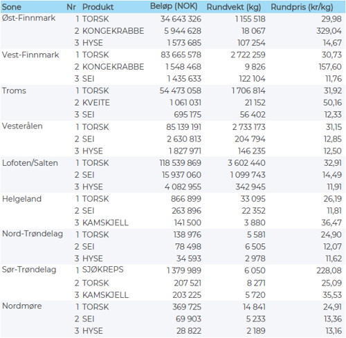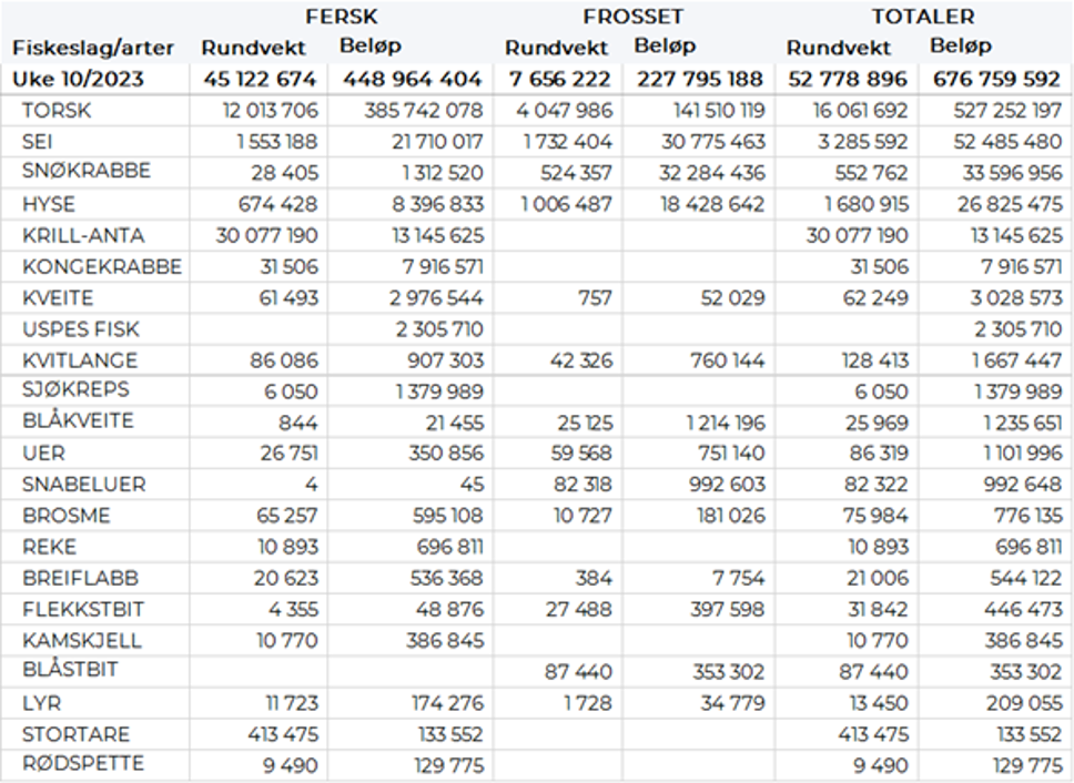 Omsetningen av ferskt råstoff i uke 10 ble 449 millioner kroner, som var opp fra 222 millioner kroner i uke 9. Torsk, sei og hyse var størst i verdi med henholdsvis 385, 22 og 8 millioner kroner, og for øvrig slik det framgår av tabell 2.