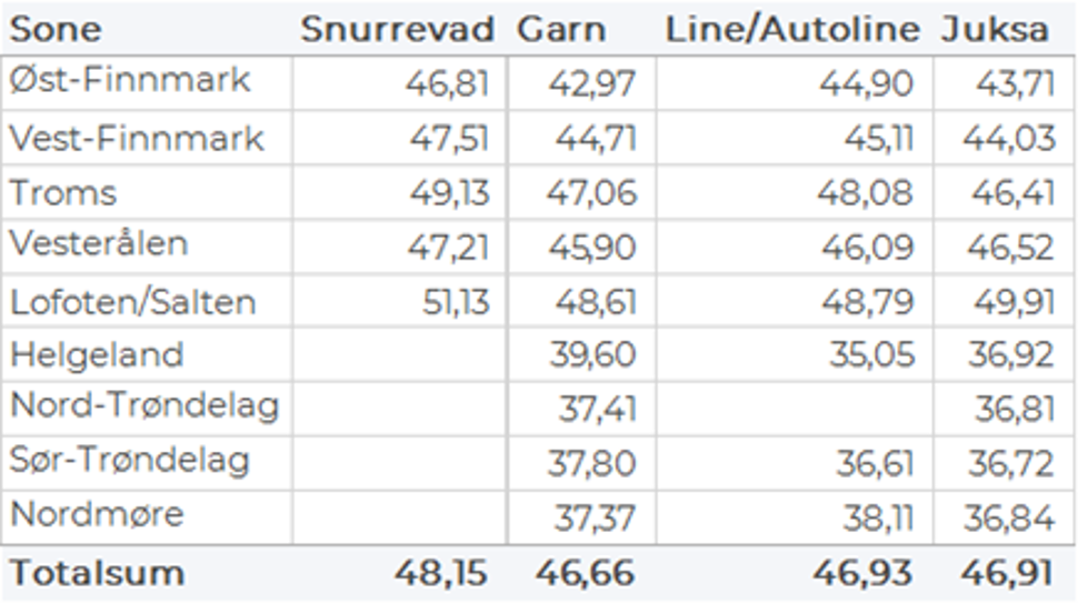 Tabell 3 og 4 viser fordelingen av landingene av fersk torsk pr leveringssone og redskap, med tilhørende snittpriser, i uke 10 i år og i fjor. De to tabellene er basert på omsetning av kvalitet A og ekstra, der alle leveringstilstander inngår, og der snittprisene er omregnet til sløyd uten hode-priser, eksklusiv restråstoff. Det framgår at fjorårets fersklandinger av torsk av nevnte kategori i uke 9 utgjorde vel 17.940 tonn, mot 1.980 tonn i år.
