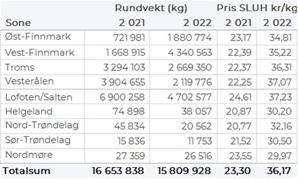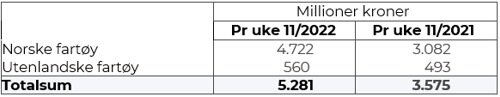 Totalomsetningen hittil i år sammenlignet med tilsvarende periode i fjor framgår av tabell 1. Den økte omsetningen for norske båter er på godt og vel 1,6 milliard kroner, fordelt med pluss på 1.044 på fersk- og 595 på frystomsetningen. Frystomsetningen er pr uke 11 i år på 1.681 millioner kroner, mens ferskomsetningen er oppe i 3.041 millioner kroner. En stor del av den økte frystomsetningen skriver seg fra sluttspurten i 2021 der kvantumet er omsatt på begynnelsen av 2022. Men økt omsetning av fryst råstoff også i uke 6, da ukerekord ble satt med 275 millioner kroner. Omsetningen av fryst torsk pr uke 11 i år er 1.030 millioner kroner mot 625 millioner kroner til samme tid i fjor, av kvantum på henholdsvis 36.190 og 31.070 tonn. Også fryst sei og hyse har ei fin øking både i kvantum og verdi. Når det gjelder omsetningen av fersklevert råstoff, drar torsken opp både pga. økte priser og økt kvantum. Kvantum fersk torsk omsatt så langt er 94.830 tonn, mot 92.780 tonn til samme tid i fjor, verdien er opp fra 1.560 til 2.340 millioner kroner. Omsatt kvantum fersk sei er opp 3.620 tonn til 18.740 tonn, og verdien er opp fra 112 til 184 millioner kroner. Kongekrabbekvantumet er opp fra 566 til 689 tonn, og som følge av økte priser er verdien økt med 137 %, fra 121 til 286 millioner kroner.