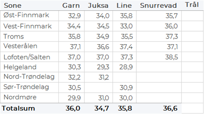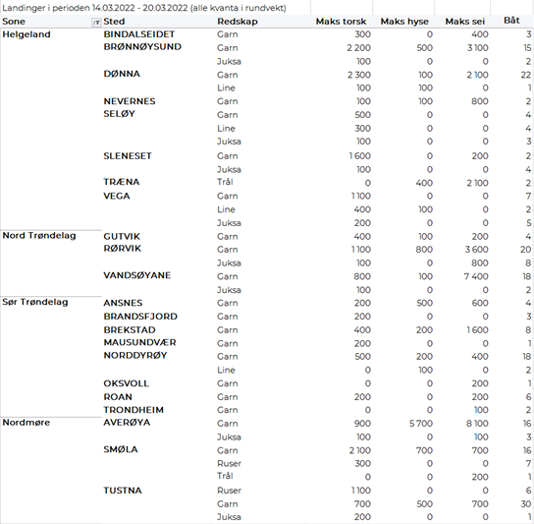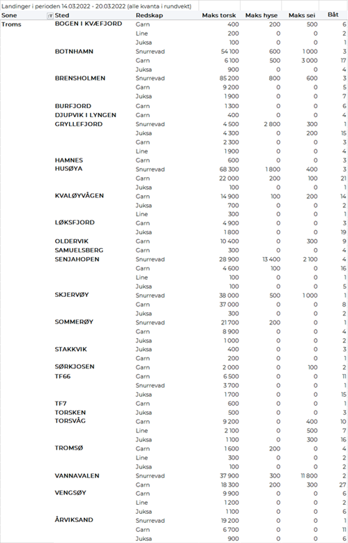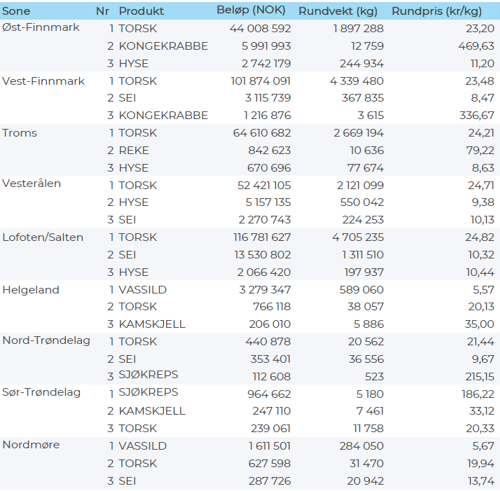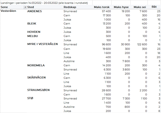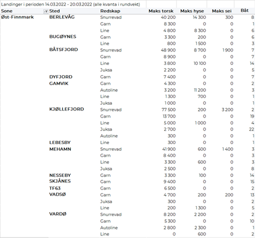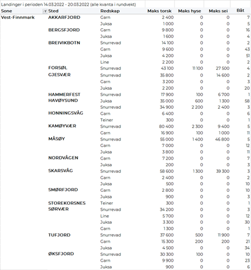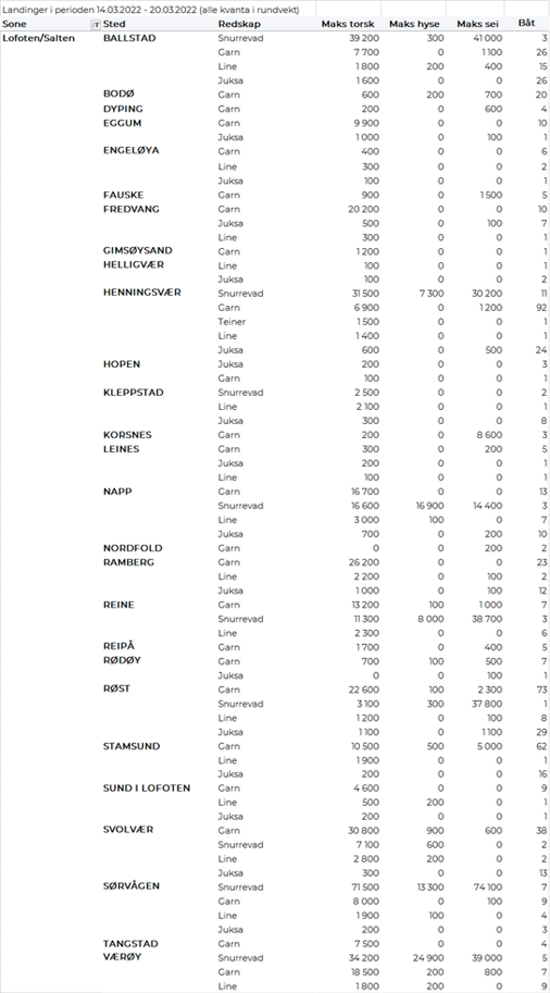 Størst garnkvantum torsk levert i Lofoten med 3.940 tonn, fulgt av Troms med 1.610 tonn, Vest-Finnmark med 1.260 tonn, Øst-Finnmark med 570 tonn, Vesterålen med 550 tonn, og Helgeland-Nordmøre med 100 tonn. Snurrevadkvantumet var fordelt med 2.270 tonn levert Vest-Finnmark, 1.530 tonn levert Vesterålen, 1.190 tonn i Øst-Finnmark, 960 tonn i Troms, og 590 tonn i Lofoten. Av juksakvantumet på totalt 1.030 tonn var 780 tonn levert i Vest-Finnmark, 70-90 tonn hver på Troms og Lofoten og ellers labert. 110 tonn av linetorsken var levert i Lofoten, deretter fulgte Øst-Finnmark med 80 tonn og Vest-Finnmark med 60 tonn.