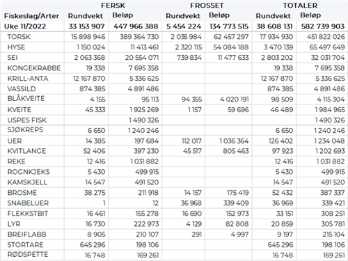 Tabell 2: Omsetning for norske båter i uke 11, 2022, fordelt pr fersk/fryst og pr fiskeslag.
