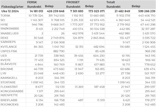 Omsetningen av fersk torsk i uke 12 utgjorde 10.740 tonn til en verdi av 392 millioner kroner, en økning fra 9.580 tonn/348 millioner kroner uken før. Toppuken så langt i år er uke 10 med 12.730 tonn og 459 millioner kroner. Det er imidlertid enda et stykke igjen til de kvantumsnivåene som toppukene i vinterfisket har pleid å ligge på. I 2021 inntraff toppuka i uke 10 med 22.333 tonn/ 356 millioner kroner omsatt. Uke 10 var også toppuken i 2022 da det ble omsatt 18.042 tonn/ 447 millioner kroner. I 2023 inntraff toppuken i uke 12 da det var omsatt 19.545 tonn/ 627 millioner kroner. Tradisjonelt sett har toppukene i vinterfisket pleid å være i uke 10-12.