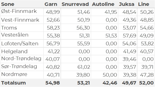 Tabell 2 og 3 viser fordelingen av landingene av fersk torsk pr leveringssone og redskap (unntatt trål), med tilhørende snittpriser. De to tabellene er basert på omsetning av kvalitet A og ekstra, der alle leveringstilstander inngår, men der snittprisene er omregnet til sløyd uten hode-priser, eksklusiv restråstoff.