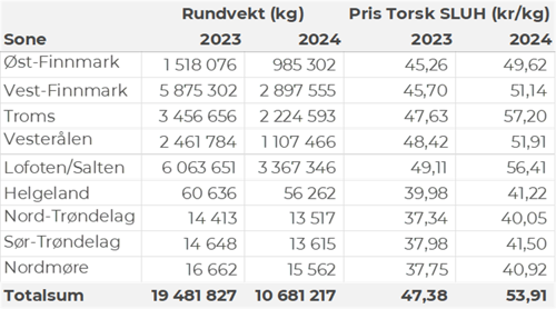 Hittil i år er det omsatt 77.160 tonn fersk torsk til en verdi av 2.819 millioner kroner. Til samme tid i fjor var det omsatt 82.780 tonn til en verdi av 2.647 millioner kroner.