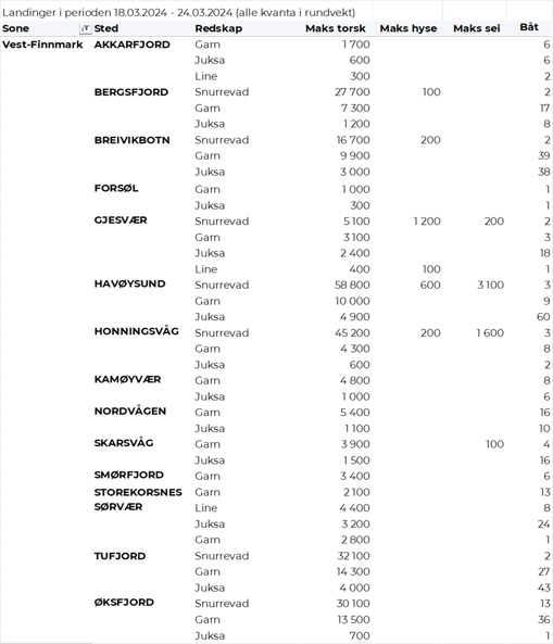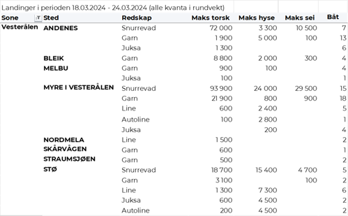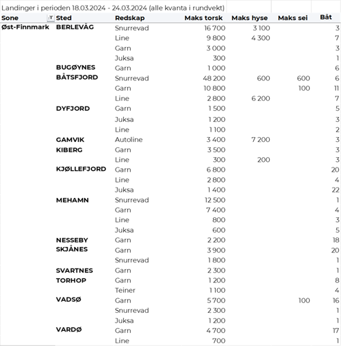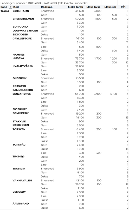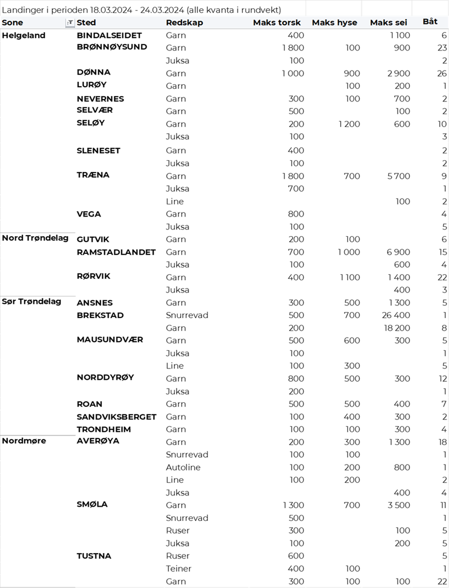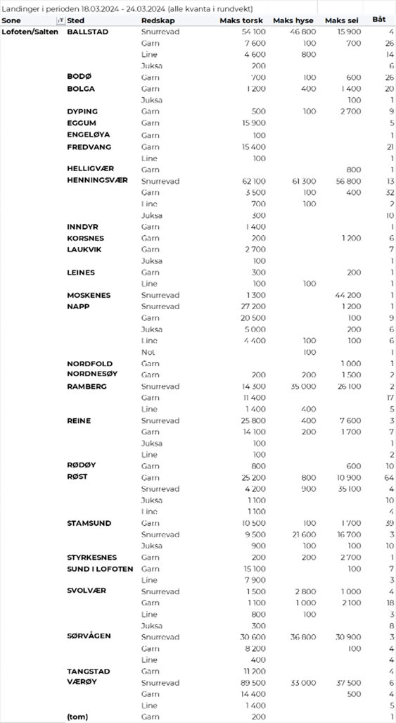 Av kvantumet i uke 12 var 5.750 tonn tatt på garn, 4.140 tonn på snurrevad, 630 tonn på juksa og 200 tonn på line/autoline. Det var god spredning på leveransene. I likhet med uka før var Lofoten største leveringssone med 3.370 tonn, hvorav 2.410 tonn fra garn og 880 tonn fra snurrevad. Videre var det levert 2.940 tonn i Vest-Finnmark, her var 1.350 tonn tatt på garn, 1.010 tonn på snurrevad og 540 tonn på juksa. I Troms var det levert 2.230 tonn, hvorav 1.120 tonn kom fra garn og 1.040 tonn fra snurrevad. Vesterålen stod for 1.110 tonn, hvorav 930 tonn fra snurrevad og 160 tonn fra garn. I Øst-Finnmark var det levert 1.000 tonn, hvorav 620 tonn kom fra garn og 280 tonn fra snurrevad. På Helgeland var det levert 60 tonn, kvanta under 20 tonn i resterende leveringssoner.