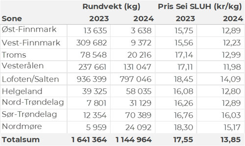 Omsetningen av fersk sei i uke 12 utgjorde 1.145 tonn til verdi 11,8 millioner kroner. En nedgang fra 1.535 tonn/ 15,3 millioner kroner uken før. Størst kvantum levert i Lofoten med 797 tonn av totalen, hvorav 653 tonn kom fra snurrevad og 140 tonn kom fra garn. Vesterålen følger deretter med 131 tonn, hvorav 125 tonn kom fra snurrevad. Fordelt per redskap er 830 tonn tatt med snurrevad og 305 tonn med garn. Den totale geografiske fordelingen fremgår av tabell 4. Det meste fra Helgeland og sørover tas med garn.