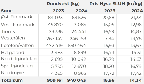 Kvantumet fersklevert hyse i uke 12 var 947 tonn til en verdi av 9,7 millioner kroner. En nedgang fra 1.414 tonn/ 14,7 millioner kroner uken før. Størst kvantum forrige uke ble levert i Lofoten med 557 tonn av totalen, hvorav 517 tonn kom fra snurrevad. Vesterålen følger deretter med 246 tonn, hvorav snurrevad sto for 191 tonn av dette. I Øst-Finnmark ble det levert 63 tonn, hvorav 56 tonn kom fra line/autoline. Troms stod for 24 tonn. Hvorav 19 tonn kom fra snurrevad. Kvanta under 13 tonn i resterende soner.