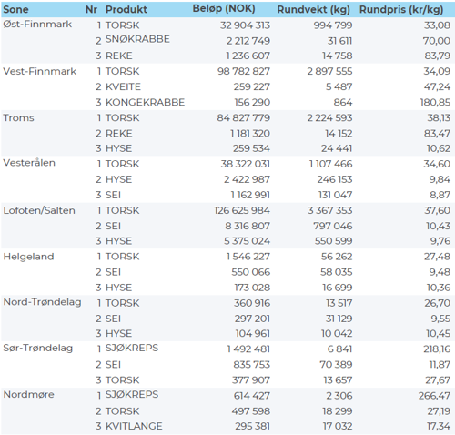 Omsetningen av ferskt råstoff i uke 12 utgjorde 426 millioner kroner, opp fra 402 millioner kroner uken før. Torsk, sei og hyse var størst i verdi med henholdsvis 392, 12 og 10 millioner kroner og for øvrig slik det framgår av tabell 1.