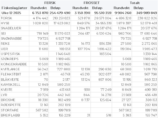 Omsetningen av ferskt råstoff i uke 12 utgjorde 254 millioner kroner, ned fra 535 millioner kroner uka før. Torsken var størst i verdi, fulgt av hyse, sei og snøkrabbe til verdi henholdsvis 210, 18, 12 og 7 millioner kroner, og for øvrig slik det framgår av tabell 1.