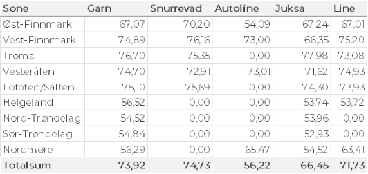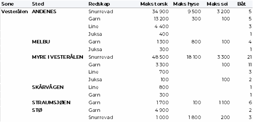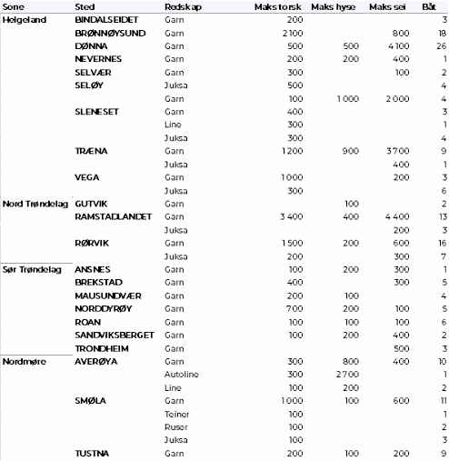 Tabell 2 og 3 viser fordelingen av landingene av fersk torsk per leveringssone og redskap (unntatt trål), med tilhørende snittpriser. De to tabellene er basert på omsetning av kvalitet A og ekstra, der alle leveringstilstander inngår, men der snittprisene er omregnet til sløyd uten hode-priser, eksklusiv restråstoff.