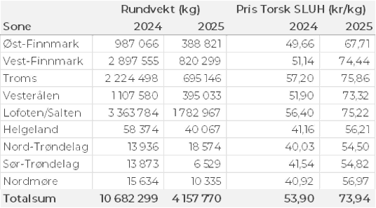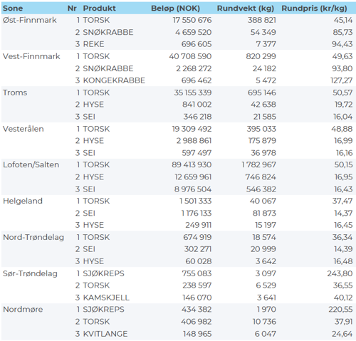 Omsetningen av fersk torsk utgjorde 4.170 tonn til verdi 210 millioner kroner. En reduksjon fra 8.790 tonn/440 millioner kroner uken før. Av totalkvantumet stod garn for 2.500 tonn etterfulgt av snurrevad med 1.470 tonn, juksa med 110 tonn og line/autoline med 90 tonn. For garn var 1.340 tonn omsatt til kjøpere i Lofoten/Salten, 475 tonn i Vest-Finnmark, 290 tonn i Troms, 240 tonn i Øst-Finnmark, 75 tonn i Vesterålen og 75 tonn i området Helgeland-Nordmøre. Av snurrevadkvantumet gikk 410 tonn til kjøpere i Lofoten, 390 tonn i Troms, 300 tonn i Vesterålen, 260 tonn i Vest-Finnmark og 100 tonn i Øst-Finnmark. Det meste av juksakvantumet var levert i Vest-Finnmark, mens linekvantumet var spredt.