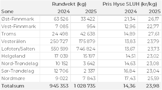 Kvantumet fersklevert hyse i uke 12 var 1.030 tonn til verdi 18 millioner kroner. Det var ned fra 1.670 tonn/29 millioner kroner uken før. Tabell 5 viser sonevis fordeling av kvanta, størst aktivitet i Lofoten og Vesterålen. Det var bare Lofoten som hadde økte leveranser fra uka før. Også i hysefisket er det snurrevad som står for størst kvantum, med 920 tonn av totalen i uke 12, ned fra 1.360 tonn uka før. 70 tonn var tatt på garn og 40 tonn på line/autoline. Av snurrevadkvantumet var 710 tonn levert i Lofoten og 170 tonn i Vesterålen.