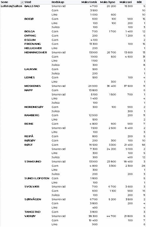 Kvanta fordelt per leveringssone fremgår av tabell 2. Sammenlignet med uke 11 var det reduksjon i landingene over hele linja. Av de 1.780 tonnene levert i Lofoten var 1.340 tonn tatt på garn, 410 tonn på snurrevad og mindre kvanta på lina og juksa.