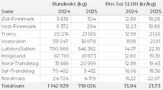 Omsetningen av fersk sei i uke 12 utgjorde 720 tonn til verdi 12 millioner kroner, som var ned fra 1.850 tonn og 31 millioner kroner i uke 11. Kvanta fersk sei fordelt per leveringssone fremgår av tabell 4. Størst aktivitet i Lofoten med 550 tonn av totalen, ned fra 1.330 tonn uka før. Av de 550 tonnene var 420 tonn tatt på snurrevad og 120 tonn på garn. Helgeland fikk sine leveranser redusert fra 210 tonn uka før til 80 tonn i uke 12. Av totalen var 470 tonn tatt på snurrevad og 240 tonn på garn, begge ned fra henholdsvis 1.130 og 690 tonn uka før.