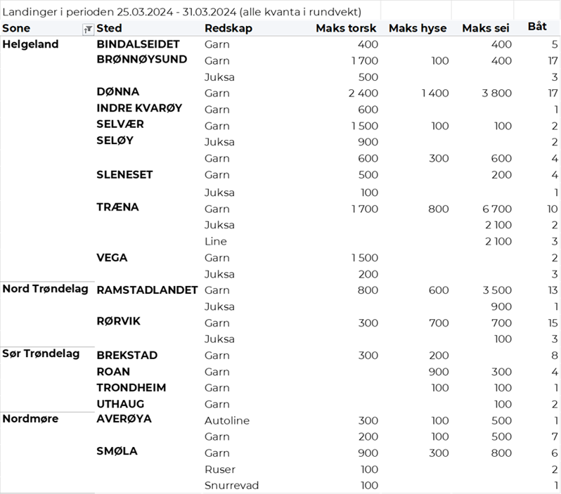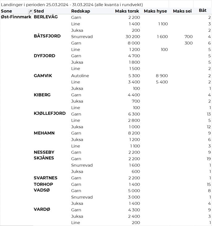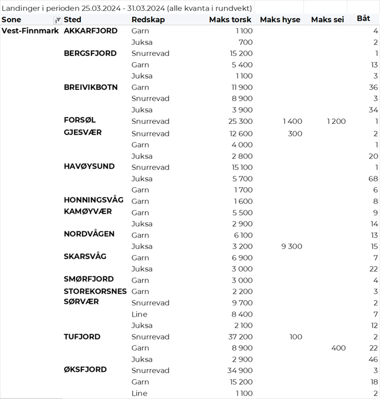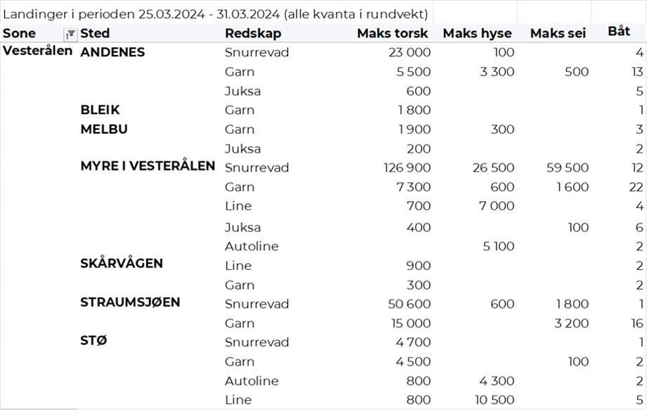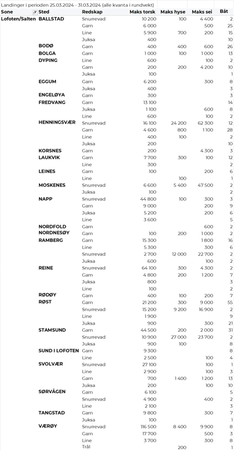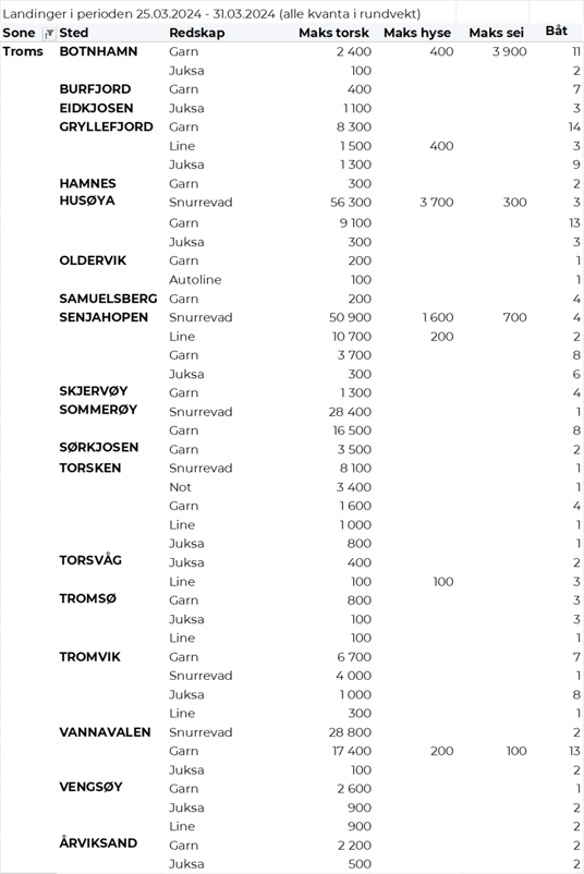 Hittil i år er det omsatt 85.270 tonn fersk torsk til en verdi av 3.119 millioner kroner. Til samme tid i fjor var det omsatt 101.330 tonn til en verdi av 3.234 millioner kroner. Av kvantumet i uke 13 var 4.020 tonn tatt på garn, 3.030 tonn på snurrevad, 820 tonn på juksa og 300 tonn på line/autoline. Det var god spredning på leveransene. I likhet med uka før var Lofoten største leveringssone med 3.100 tonn, hvorav 2.000 tonn fra garn, 850 tonn fra snurrevad, 190 var tatt på lina og 50 tonn på juksa. Videre var det levert 2.050 tonn i Vest-Finnmark, her var 880 tonn tatt på garn, det meste av juksakvantumet var levert der med 700 tonn, og 440 tonn var tatt på snurrevad. Av tabellene bakerst i denne ukes rapport ser vi at det var 68 juksabåter i godt fiske med leveranser i Havøysund, 46 i Tufjord, 34 i Breivikbotn, 22 i Skarsvåg og 20 i Gjesvær. I Troms var det levert 1.340 tonn, hvorav 670 tonn var tatt på snurrevad og 630 tonn på garn. Vesterålen stod for 1.130 tonn, hvorav 980 tonn fra snurrevad og 140 tonn fra garn. I Øst-Finnmark var det levert 490 tonn, hvorav 320 tonn kom fra garn og 90 tonn fra snurrevad. På Helgeland var det levert 50 tonn, kvanta under 5 tonn i resterende leveringssoner.