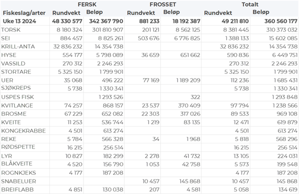 Tabell 1: Omsetning for norske båter i uke 13/2024, fordelt pr fersk/fryst og pr fiskeslag.
