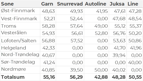 Tabell 2 og 3 viser fordelingen av landingene av fersk torsk pr leveringssone og redskap (unntatt trål), med tilhørende snittpriser. De to tabellene er basert på omsetning av kvalitet A og ekstra, der alle leveringstilstander inngår, men der snittprisene er omregnet til sløyd uten hode-priser, eksklusiv restråstoff.