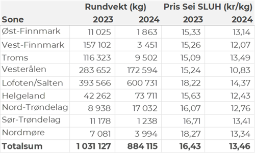 Omsetningen av fersk sei i uke 13 utgjorde 884 tonn til verdi 8,8 millioner kroner. En nedgang fra 1.145 tonn/ 11,8 millioner kroner uken før. Størst kvantum levert i Lofoten med 601 tonn av totalen, hvorav 450 tonn kom fra snurrevad og 140 tonn kom fra garn. Vesterålen følger deretter med 173 tonn, hvorav 158 tonn kom fra snurrevad. Fordelt per redskap er 613 tonn tatt med snurrevad og 249 tonn med garn. Den totale geografiske fordelingen fremgår av tabell 4. Det meste fra Helgeland og sørover tas med garn.