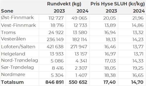 Kvantumet fersklevert hyse i uke 13 var 554 tonn til verdi 5,8 millioner kroner. En nedgang fra 947 tonn/ 9,7 millioner kroner uken før. Størst kvantum forrige uke ble levert i Lofoten med 273 tonn av totalen, hvorav 239 tonn kom fra snurrevad. Vesterålen følger deretter med 183 tonn, hvorav snurrevad sto for 128 tonn av dette. I Øst-Finnmark ble det levert 49 tonn, hvorav 45 tonn kom fra line/autoline. Kvanta under 14 tonn i resterende leveringssoner.