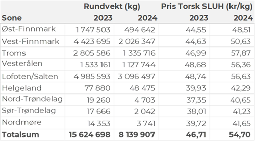 Omsetningen av fersk torsk i uke 13 utgjorde 8.180 tonn til en verdi av 302 millioner kroner, en reduksjon fra 10.740 tonn/392 millioner kroner uken før. Toppuken så langt i år er uke 10 med 12.730 tonn og 459 millioner kroner. Det er imidlertid enda et stykke igjen til de kvantumsnivåene som toppukene i vinterfisket har pleid å ligge på. I 2021 inntraff toppuka i uke 10 med 22.333 tonn/ 356 millioner kroner omsatt. Uke 10 var også toppuken i 2022 da det ble omsatt 18.042 tonn/ 447 millioner kroner. I 2023 inntraff toppuken i uke 12 da det var omsatt 19.545 tonn/ 627 millioner kroner. Tradisjonelt sett har toppukene i vinterfisket pleid å være i uke 10-12.