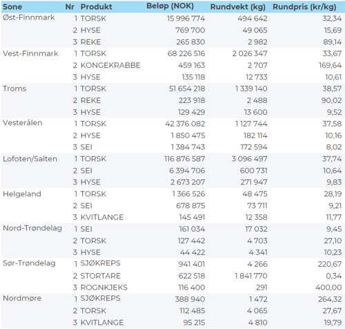 Omsetningen av ferskt råstoff i uke 13 utgjorde 342 millioner kroner, ned fra 426 millioner kroner uken før. Torsk, sei og hyse var størst i verdi med henholdsvis 302, 9 og 6 millioner kroner og for øvrig slik det framgår av tabell 1.