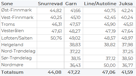 Totalomsetningen hittil i år sammenlignet med samme periode i fjor framgår av tabell 1. Omsetningen for norske båter så langt i år er 123 millioner kroner mer enn fjorårets, mens for utenlandske er det en reduksjon på 114 millioner kroner. For norske båter er andelen fersklevert råstoff opp med 195 millioner kroner, fra 4.379 millioner kroner i fjor til 4.574 millioner kroner i år. Når det gjelder fersk torsk er 115.710 tonn levert til verdi 3.679 millioner kroner, mot 144.100 tonn og 3.560 millioner kroner til samme tid i fjor. Kvantumet er dermed 28.380 tonn lavere, men verdien likevel opp 119 millioner kroner. Omsetningen av fersk sei trekker også opp, med 27.500 tonn/365 millioner kroner hittil i år, mot 22.120 tonn/216 millioner kroner i fjor. For fersk sei er kvantumet økt med 5.380 tonn og verdien er økt 148 millioner kroner. Kongekrabben trekker i motsatt retning, her er verdien ned vel 90 millioner kroner, fra 295 i fjor til 202 i år.