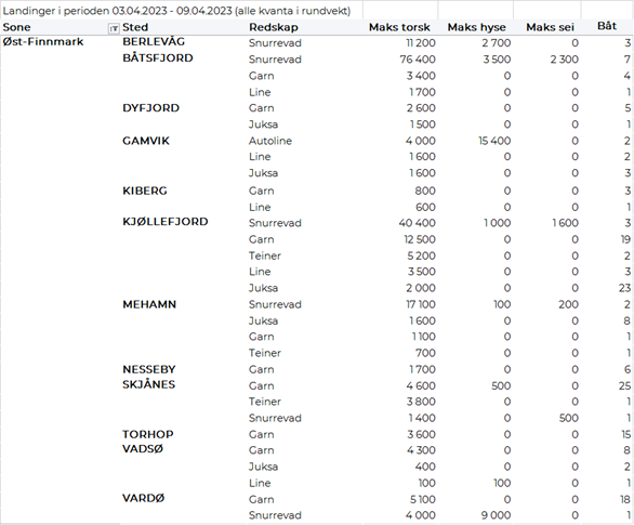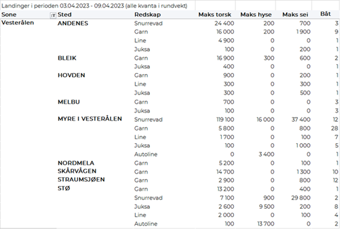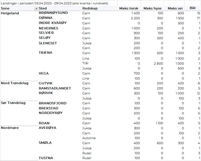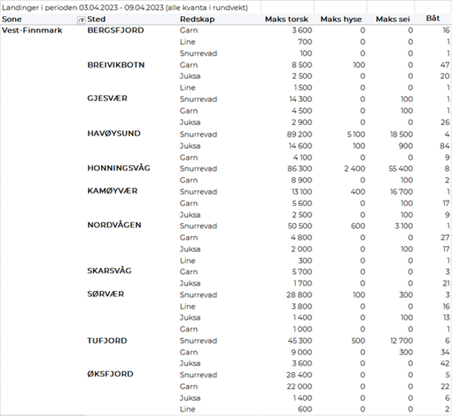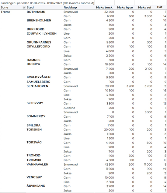 Omsetningen av fersk torsk, alle kvaliteter og tilstander, i uke 14 utgjorde 11.570 tonn til verdi 356 millioner kroner, som er ned fra 15.570 tonn og 495 millioner kroner uka før. Fordelt per redskap i uke 14 viser tallene 6.280 tonn tatt på garn, 3.920 tonn på snurrevad, 840 tonn på juksa og 520 tonn fra line/autoline. Det har ikke vært trållandinger med fersk torsk i uke 10, 11, 12, 13 og 14. Geografisk var størst kvantum denne gang omsatt i Vest-Finnmark med 3.770 tonn, fulgt av Lofoten med 3.310 tonn, Troms med 1.930 tonn, Vesterålen med 1.460 tonn, Øst-Finnmark med 1.080 tonn, og knappe 40 tonn var omsatt i området Helgeland-Nordmøre. Av kvantumet levert Vest-Finnmark var 1.790 tonn tatt på snurrevad, 1.260 tonn på garn, 650 tonn på juksa og 70 tonn på lina. I Lofoten dominerer garn med 2.480 tonn fulgt av snurrevad og line med 370 tonn på hver, og juksa med 90 tonn. Også i Troms var det garn som stod for det meste av leveransene med 1.550 tonn, her var i tillegg 310 tonn tatt på snurrevad og 30 tonn hver på line og juksa. I Vesterålen var 940 tonn av nevnte 1.460 tonn snurrevadtorsk, mens garn stod for 490 tonn. I Øst-Finnmark var 510 tonn tatt på snurrevad, 460 tonn på garn og 60 tonn på juksa. I Vest-Finnmark har det vært størst leveranser i området Måsøy, Nordkapp, Hasvik og Loppa. Mye små torsk på snurrevad har resultert i lavere snittpriser på torsk levert i Vest-Finnmark. I Lofoten er størst kvantum levert på Ramberg, Fredvang, Stamsund og Røst. Her er det stor aktivitet med mye garnbruk på yttersida nær land fra Bø til Røst. I Troms har det vært størst aktivitet på Vannøya, Kvaløya/Vengsøy og Senja, mens det i Vesterålen er Myre og Andenes som har hatt mest torsk levert i påskeuka. I Øst-Finnmark er det Båtsfjord, Kjøllefjord, Skjånes og Vardø som har mottatt størst kvantum.
