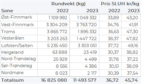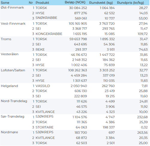 Foreløpige tall for omsetningen av fryst råstoff i perioden viser 23 millioner kroner, som er ned fra 128 millioner kroner uka før. 320 tonn torsk og 490 tonn sei var størst i verdi med henholdsvis 12 og 9 millioner kroner.