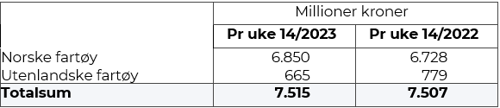 Tilsvarende for uke 14 i fjor var omsetningen 654 millioner kroner, hvorav utenlandske leveranser utgjorde 70 millioner kroner. Omsetningen for norske båter på 584 millioner kroner var fordelt med 452 på fersk og 132 på fryst råstoff.