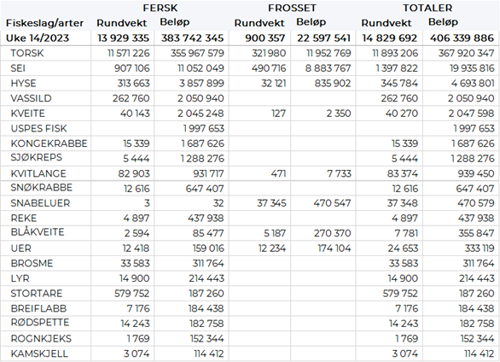 Omsetningen av ferskt råstoff i uke 14 ble 384 millioner kroner, ned fra 537 millioner kroner uka før. Torsk, sei og hyse var størst i verdi med henholdsvis 356, 11 og 4 millioner kroner, og for øvrig slik det framgår av tabell 2.