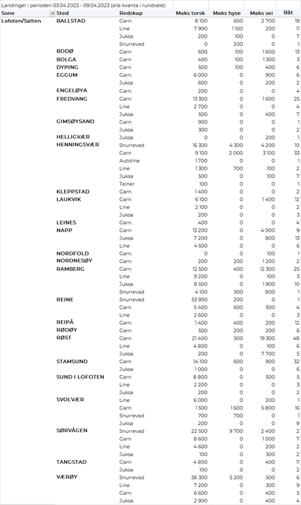 Det har vært stor fiskeriaktivitet i påskeuka, der de fleste av kjøperne har holdt åpent. Store og små fiskebåter har levert vel 11.500 tonn fersk torsk, hvilket er mye til å være i påsken. Mye dårlig vær hittil i sesongen og skreiens sene ankomst er årsaken til dette. Størst kvantum var fisket og levert i Vest-Finnmark, tett fulgt av Lofoten. Det fiskes fortsatt godt med torsk på garn nær land langs yttersida av Lofoten, men her må man regne med at vi snart synger på siste vers av årets sesong.