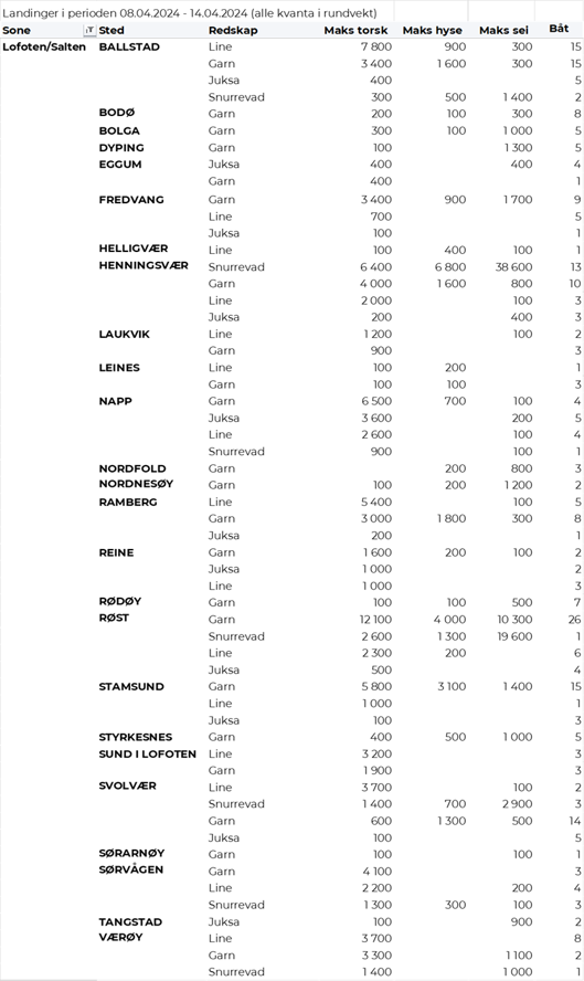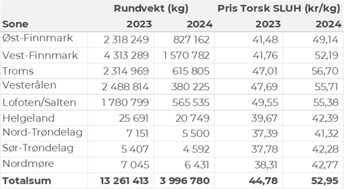 Omsetningen av fersk torsk i uke 15 utgjorde vel 4.000 tonn til en verdi av 143 millioner kroner, en reduksjon fra 6.160 tonn/221 millioner kroner uken før. Toppuken så langt i år er uke 10 med 12.730 tonn og 459 millioner kroner. Det er imidlertid enda et stykke igjen til de kvantumsnivåene som toppukene i vinterfisket har pleid å ligge på. I 2021 inntraff toppuka i uke 10 med 22.333 tonn/ 356 millioner kroner omsatt. Uke 10 var også toppuken i 2022 da det ble omsatt 18.042 tonn/ 447 millioner kroner. I 2023 inntraff toppuken i uke 12 da det var omsatt 19.545 tonn/ 627 millioner kroner. Tradisjonelt sett har toppukene i vinterfisket pleid å være i uke 10-12.