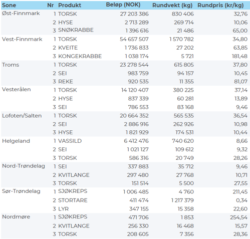 Hittil i år er det omsatt 95.450 tonn fersk torsk til en verdi av 3.483 millioner kroner. Til samme tid i fjor var det omsatt 125.180 tonn til en verdi av 3.965 millioner kroner.